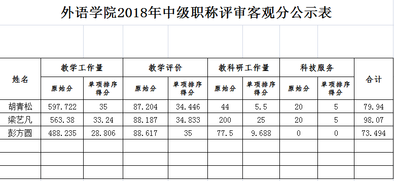 根據《安康學院講師任職資格評審指導意見》、《安康學院職稱評審中科研成果計分辦法(修訂)》和《外語學院中級職稱評審辦法》,經個人申報,職稱評審工作小組初步審核,現將參評教師客觀分公示如下。公示期3天(11月2日-4日)。 如有異議,請在11月5日上午9點前以書面形式向職稱評審小組反映。