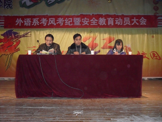 隨著期末考試和寒假的臨近,為進一步加強學風建設,嚴明考試紀律和提高學生的冬季安全防范意識,2010年1月10晚,外語系在東校區(qū)大禮堂召開了考風考紀暨安全教育動員大會,系黨總支書記李巖、輔導員周靜老師以及全體在校學生參加了動員大會,會議由系學工辦主任任森龍主持。