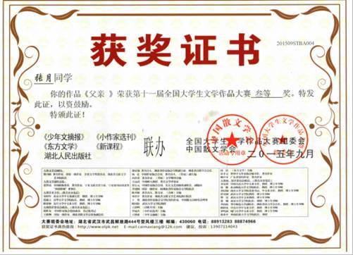 2015年9月,外語學(xué)院數(shù)名學(xué)生在此文學(xué)賽事中榮獲佳績。其中,程曉潔的作品《情定前世今生父女的緣》,張?jiān)碌淖髌贰陡赣H》等外語學(xué)院學(xué)生的作品被收錄進(jìn)《第十一屆全國學(xué)生作文大賽優(yōu)秀作品選》集內(nèi)。
