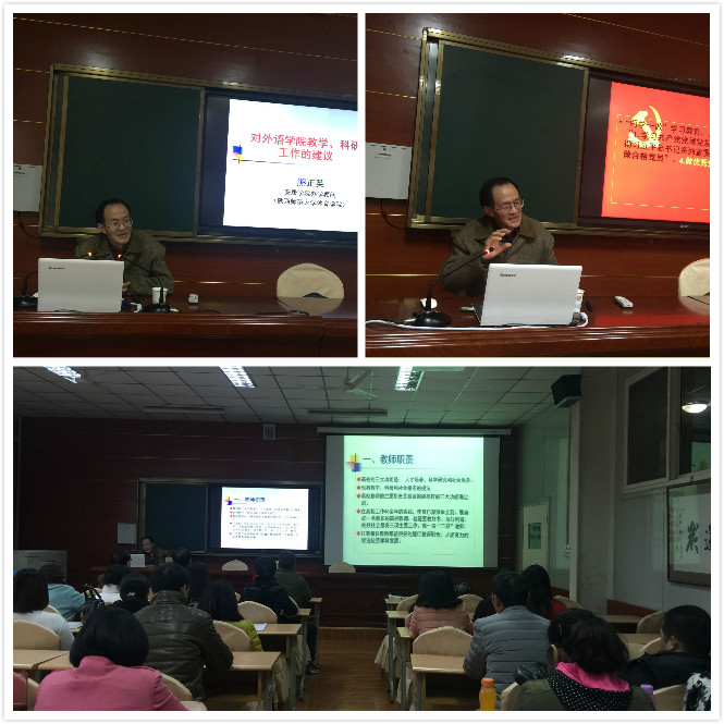 11月23日下午,我校辦學(xué)顧問熊正英教授應(yīng)邀在1018為外語學(xué)院作教學(xué)科研講座。外語學(xué)院黨政領(lǐng)導(dǎo)和全體教師共同聆聽了報(bào)告。