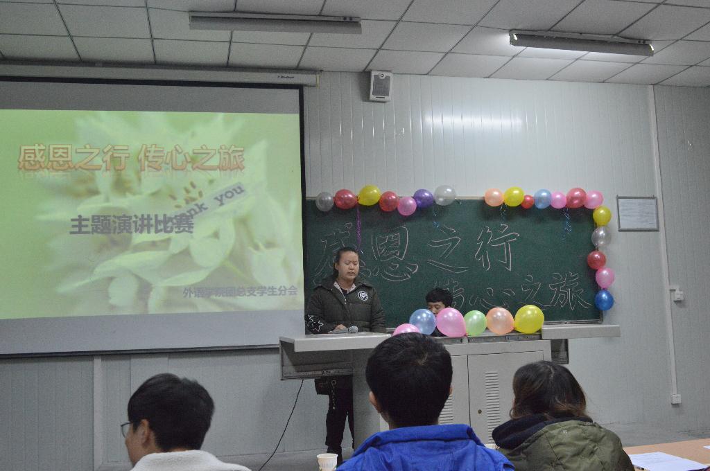 為了培養(yǎng)學(xué)生樹立感恩意識(shí)和奉獻(xiàn)精神,外語學(xué)院于2016年11月30日晚在1022教室舉辦了主題為“感恩之心、傳心之旅”的感恩教育演講比賽。外語學(xué)院團(tuán)總支書記常遠(yuǎn)紅、專業(yè)教師趙雨恒及全體學(xué)生會(huì)成員、2016級(jí)學(xué)生參加了本次活動(dòng)。