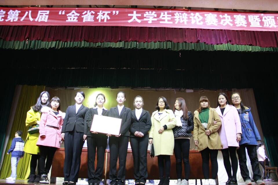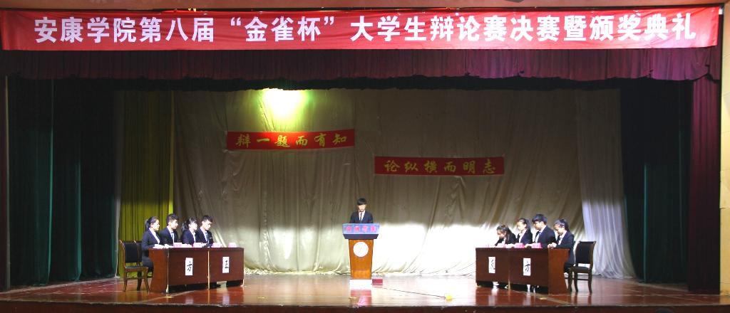 2016年11月18日晚,安康學院第八屆“金雀杯”大學生辯論賽決賽在安康學院江南大禮堂舉行。由輔導員常遠紅領隊,2014級學生陳震宇,黃曉鈺,2015級學生張漂漂,汪亦菲等四名同學組成的外語學院代表隊,精心準備,團結協(xié)作,發(fā)揮出色,歷經(jīng)初賽、半決賽,頑強拼搏進入了決賽。