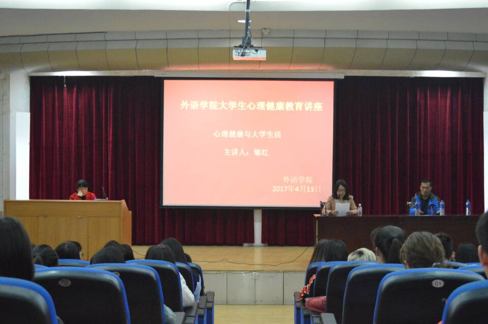 4月13日晚上,外語學(xué)院在江南校區(qū)1號(hào)教學(xué)樓6樓報(bào)告廳隆重舉行了大學(xué)生心理健康教育講座。本次講座旨在向同學(xué)們介紹大學(xué)生心理健康與大學(xué)生人際交往的問題,由教育學(xué)院心理健康老師郇紅擔(dān)任主講人。參加此次活動(dòng)的有外語學(xué)院輔導(dǎo)員 楊厚東、常遠(yuǎn)紅以及2016級(jí)全體學(xué)生。