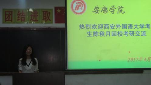 4月23日晚7:30,應(yīng)我院邀請,我院2016屆校友西安外國語大學(xué)在讀研究生陳秋月返回母校,在6405教室為2014級、2015級和2016級專升本學(xué)生重點就學(xué)科教學(xué)方向考研進(jìn)行了輔導(dǎo)交流。學(xué)院副院長張哲華參加了此次活動。
