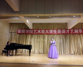 2017年5月5日19點30分,安康學院藝術類大學生英語才藝展示暨英語技能訓練成果匯演在江北1401演藝廳隆重舉行。教務處實踐教學科徐江濤科長、外語學院副院長李繼平、藝術學院副院長孫海洋、藝術類大學英語課程團隊指導教師周凡雅、王瓊及藝術學院2016級學生觀看了演出。