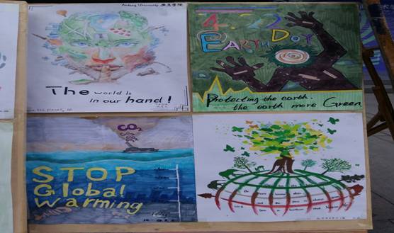 本次活動是“我校大學英語課程應用型轉型改革”的一部分,是2016級音樂專業(yè)和視覺傳達專業(yè)大學英語課堂教學和第二課堂拓展成果的階段匯報。從本學期開始,藝術類大學英語課程改革進入實質性突破階段,課堂教學在基礎語言技能訓練的同時,加入大量與專業(yè)相關的英語交際能力培養(yǎng),教學模式采用“任務型”、“情景化”,和“主題性”的應用能力訓練。其中音樂專業(yè)的《大學英語2》加入西方音樂賞析、歌劇原唱、外文歌曲說唱、話劇演練等訓練模塊;視覺傳達專業(yè)《大學英語2》則積極調動學生的創(chuàng)意興趣,以作品創(chuàng)意為主導思想,鼓勵學生以英語語言和藝術語言相結合的思路,創(chuàng)作主題設計作品,充分調動了學生的語言學習熱情。本次兩個專業(yè)的作品展示都是以“世界地球日”為主題。