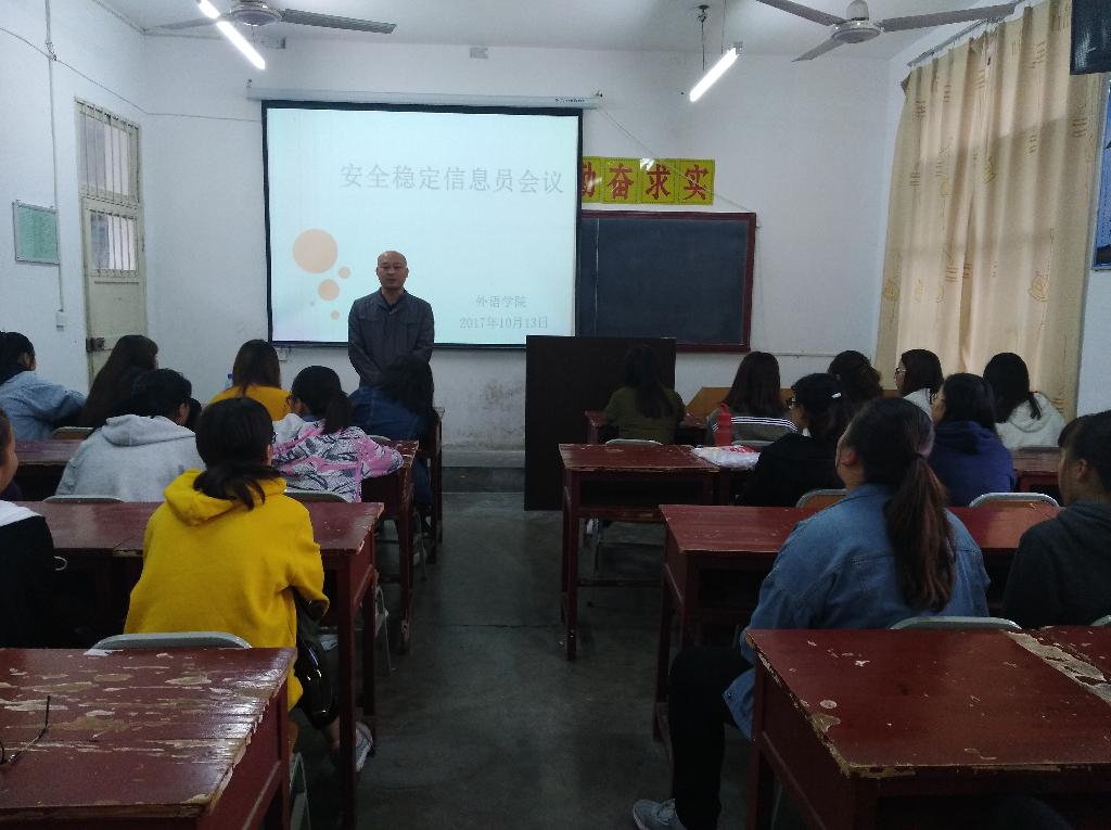 2017年10月13日下午4:30,外語學(xué)院在6303教室召開安全穩(wěn)定信息員工作會(huì)議,外語學(xué)院團(tuán)總支和學(xué)生分會(huì)主要干部、各班信息員(團(tuán)支部書記)、各宿舍信息員(宿舍長)共50余人參加。