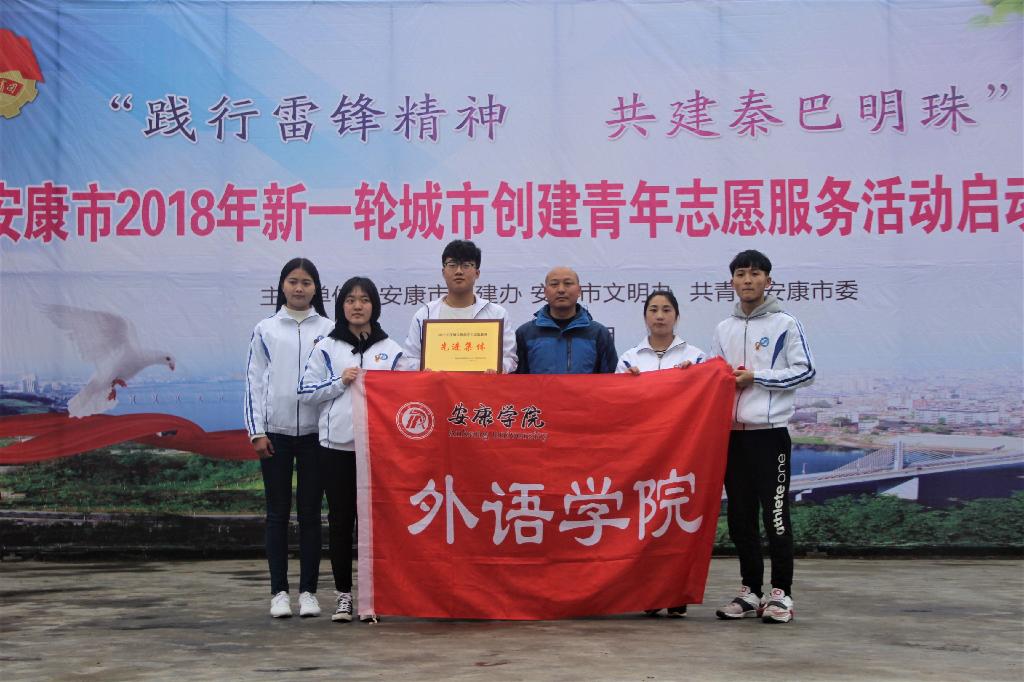 2017年,在外語(yǔ)學(xué)院黨總支的領(lǐng)導(dǎo)下,在學(xué)校團(tuán)委的大力支持下,外語(yǔ)學(xué)院團(tuán)總支積極組織廣大學(xué)生黨員、團(tuán)員青年,成立青年志愿者服務(wù)隊(duì),每月對(duì)香溪洞景區(qū)開展義務(wù)清掃、衛(wèi)生保潔、創(chuàng)建宣傳、旅游服務(wù)等志愿服務(wù)活動(dòng),受到安康廣大市民的稱贊,社會(huì)反響良好,為安康的市容美化、城市宣傳和國(guó)家森林城市創(chuàng)建做出了積極貢獻(xiàn)。