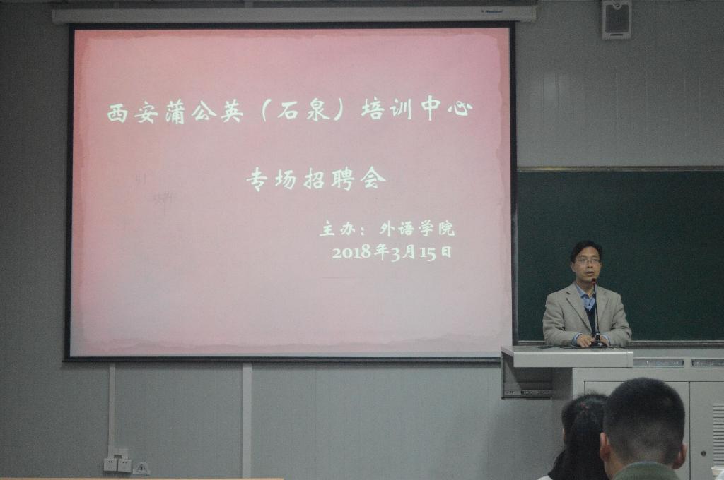為積極推動外語學院2018屆畢業(yè)生就業(yè)工作,服務和方便畢業(yè)生求職,應我院邀請,3月15日下午四點,西安蒲公英(石泉)培訓中心在1014室為我院2018屆畢業(yè)生舉辦了專場招聘會,學院副院長張哲華、輔導員常遠紅老師以及全體2018屆全體畢業(yè)生參加了此次招聘會。