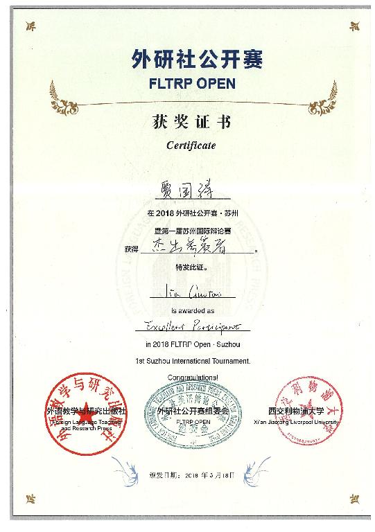 3月16日-18日,第一屆蘇州國(guó)際辯論公開(kāi)賽在西交利物浦大學(xué)舉行。我院英語(yǔ)2017級(jí)賈國(guó)濤同學(xué)應(yīng)邀參加并獲得“杰出參賽者”榮譽(yù)。