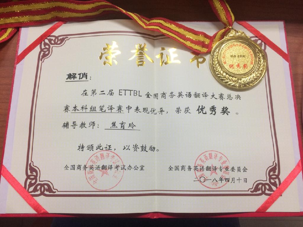 4月15日,第二屆ETTBL全國(guó)商務(wù)英語翻譯大賽在北京外國(guó)語大學(xué)舉行。參加本次大賽初賽共有全國(guó)128所高校12000余名選手;復(fù)賽涉及20個(gè)省份,最終晉級(jí)總決賽有53所高校的135名選手。安康學(xué)院外語學(xué)院英語專業(yè)2015級(jí)2班解俏同學(xué)代表陜西省參加全國(guó)總決賽并獲得國(guó)家級(jí)優(yōu)秀獎(jiǎng)。