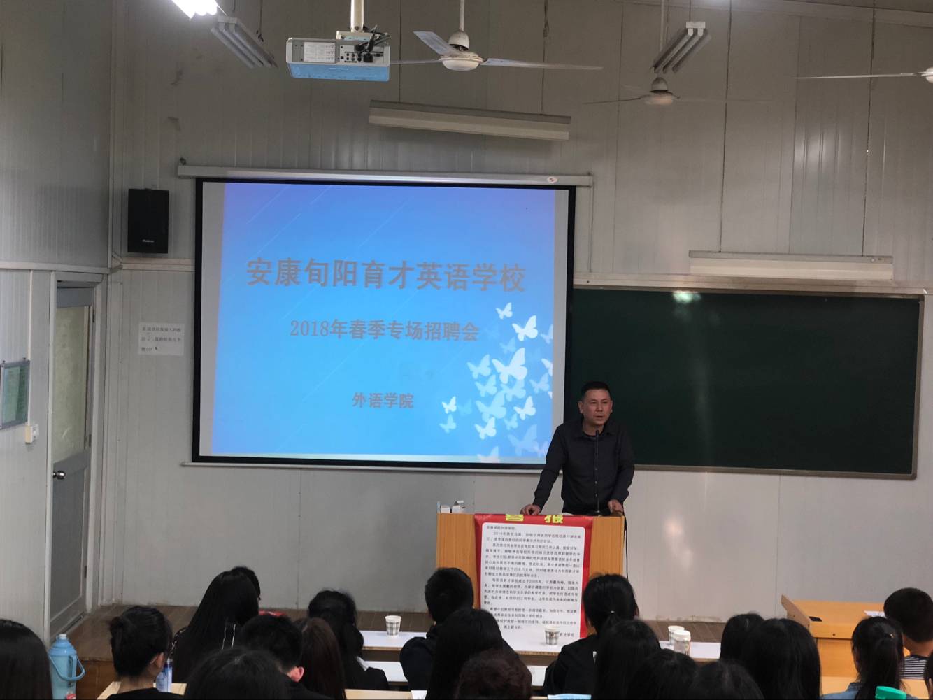 為幫助學生了解就業(yè)市場,促進2018屆畢業(yè)生順利就業(yè),4月19日下午,外語學院在6號教學樓6407教室舉辦了旬陽育才學校專場招聘會。參加此次招聘會的有旬陽育才學校校長趙輝、外語學院副院長張哲華、學工辦主任郝禮軍、畢業(yè)班輔導(dǎo)員常遠紅以及2018屆畢業(yè)生。