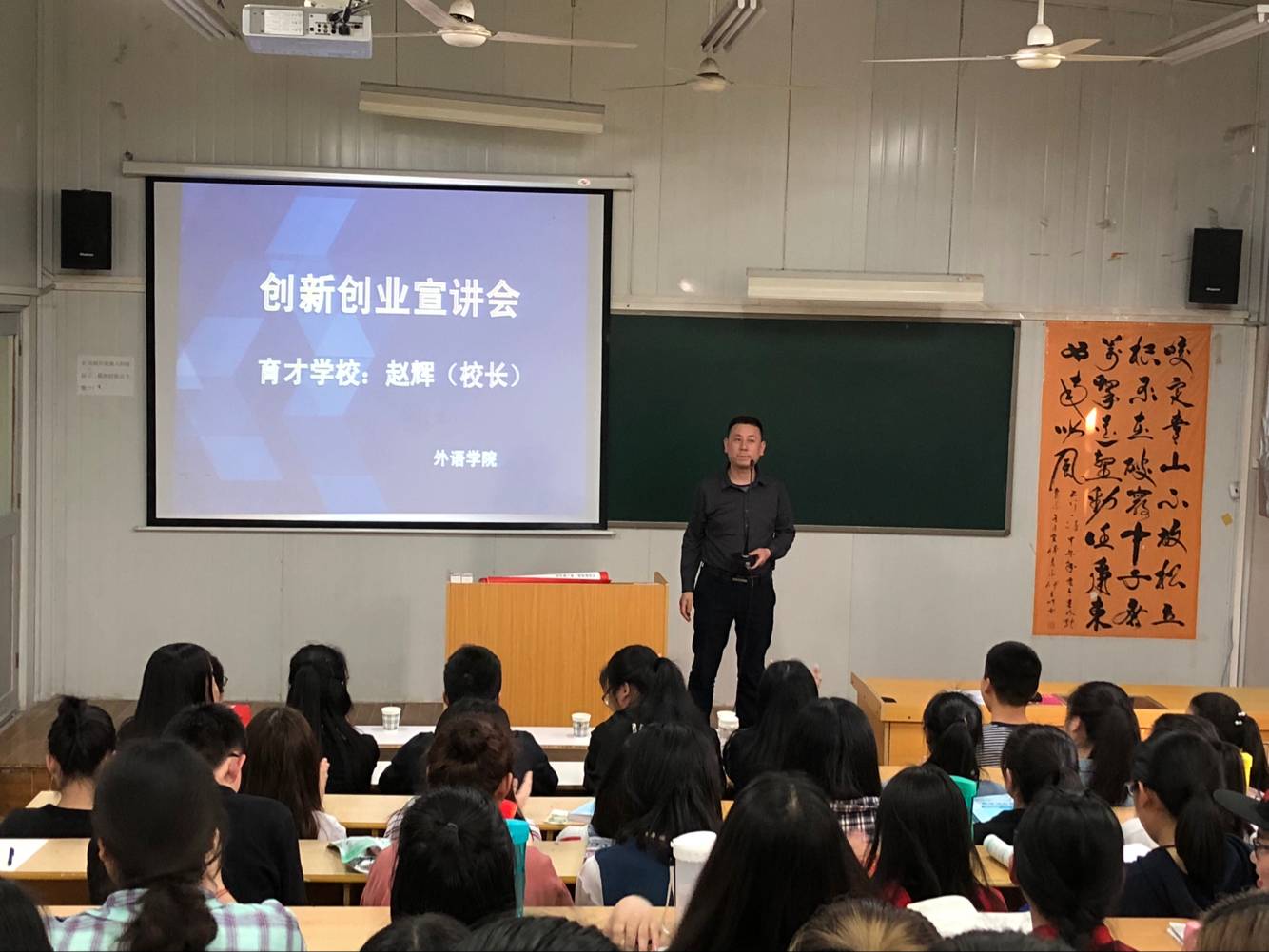 4月19日下午,在6號(hào)教學(xué)樓6407,旬陽(yáng)育才學(xué)校校長(zhǎng)趙輝應(yīng)我院邀請(qǐng)為學(xué)生做創(chuàng)新創(chuàng)業(yè)報(bào)告。外語(yǔ)學(xué)院副院長(zhǎng)張哲華、學(xué)工辦主任郝禮軍、輔導(dǎo)員常遠(yuǎn)紅、2014級(jí)部分畢業(yè)生以及2017級(jí)全體學(xué)生參加了此次報(bào)告會(huì)。報(bào)告會(huì)由學(xué)工辦主任郝禮軍主持。