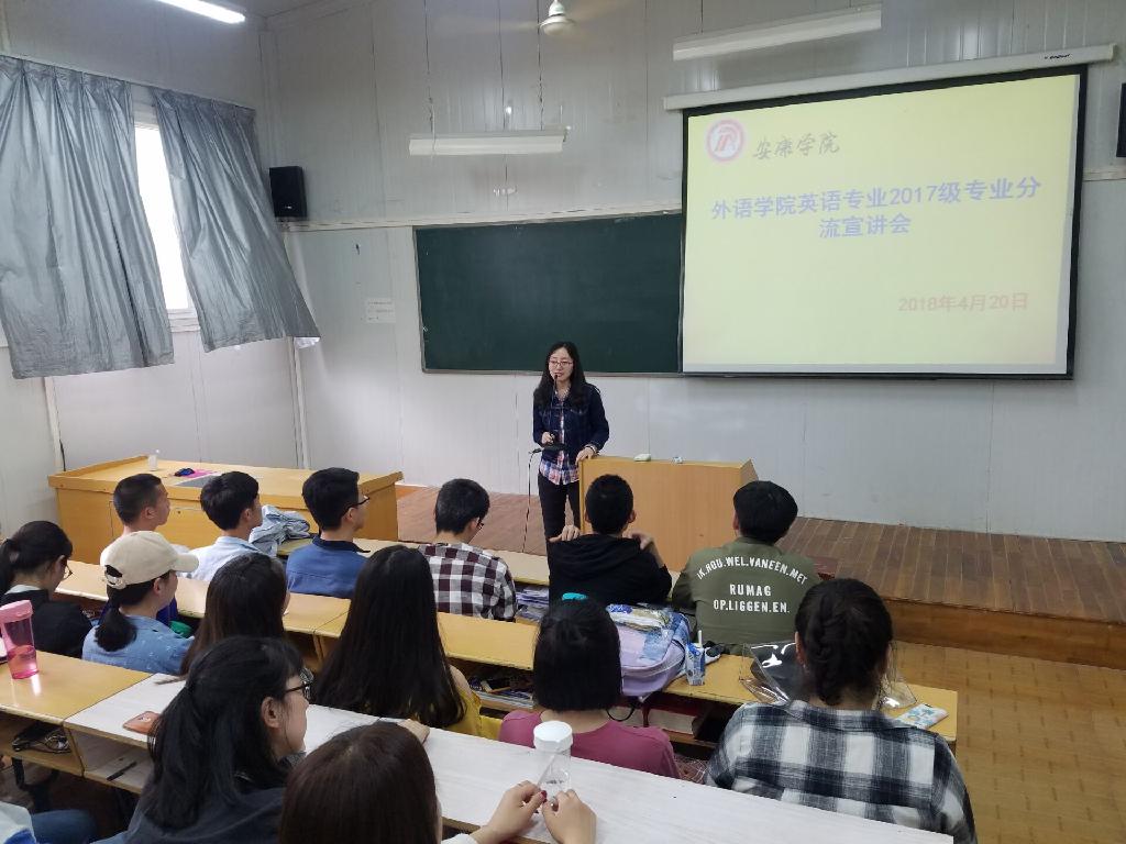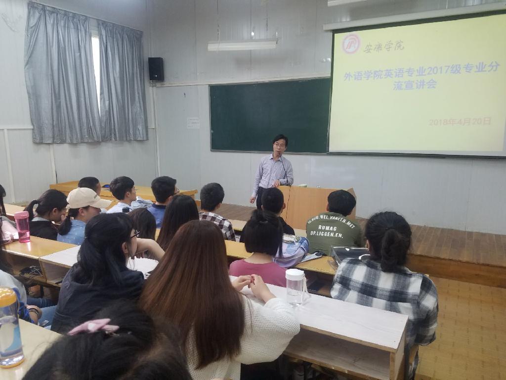 為適應應用型英語人才培養(yǎng)需要,針對學生專業(yè)發(fā)展與就業(yè)多元化需求,幫助學生明確對英語專業(yè)(職業(yè))方向的認識,4月20日下午,外語學院在六號教學樓6407教室召開了英語專業(yè)2017級學生專業(yè)方向分流宣講會。副院長張哲華、英語系主任趙龍、商務英語翻譯團隊教師陳蕾參加了會議。