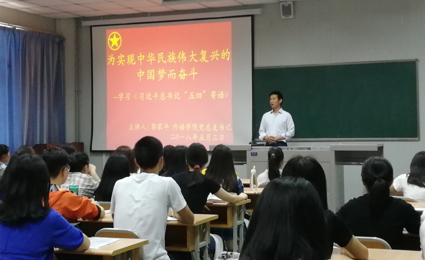 2018年5月3日,外語學院黨總支書記郭家平在1015教室為外語學院各班青年代表做為實現(xiàn)中華民族偉大復興的中國夢而奮斗――學習《習近平總書記關于“五四”的寄語》的輔導報告。報告會由外語學院團總支書記郝禮軍主持。