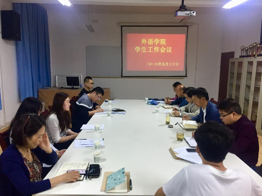 學(xué)工辦主任郝禮軍匯報(bào)了2018上半年我院學(xué)生工作情況。開學(xué)以來,我院學(xué)生工作在學(xué)校職能部門和學(xué)院黨政領(lǐng)導(dǎo)的關(guān)心指導(dǎo)下,全體師生通力合作,取得了“安康市創(chuàng)建青年志愿服務(wù)先進(jìn)集體”、“安康市五四團(tuán)總支”等榮譽(yù)稱號,并在剛剛結(jié)束的安康學(xué)院第四十屆體育運(yùn)動會中榮獲運(yùn)動成績和團(tuán)體操兩項(xiàng)獎。在常規(guī)工作方面,我院的“兩早一晚”檢查、學(xué)生安全工作、宿舍檢查工作、請假晚歸制度執(zhí)行情況、評優(yōu)工作等有序開展。后期主要是做好外語文化藝術(shù)節(jié)、畢業(yè)生文明離校、期末考試、暑期社會實(shí)踐、貧困生暑期家訪等方面工作。