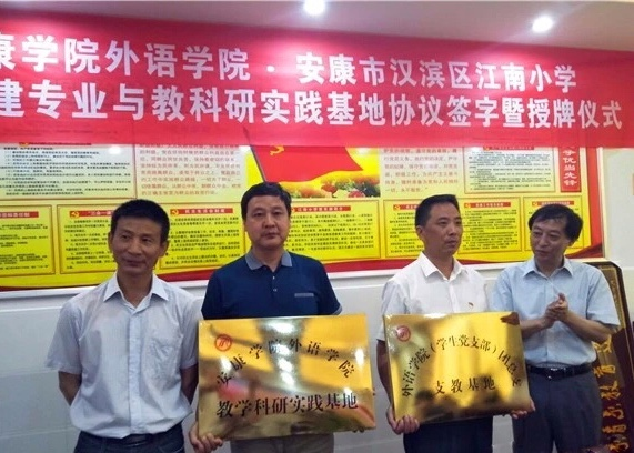 外語學院院長哈紅光、外語學院黨總支書記郭家平向江南小學授予了“教科研實踐基地”、“外語學院學生黨支部團總支支教基地”牌匾。江南小學同時向外語學院贈送了“情系教育,造福桑梓”的牌匾。