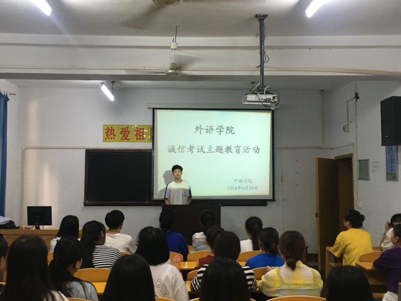 期末考試在即,為進一步嚴肅考風考紀,深入推進學風建設,營造良好的學習氛圍,增強學生誠信意識,避免考試違紀現象發(fā)生,6月28日下午,外語學院各班開展誠信考試教育班會。