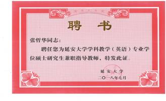 日前,延安大學(xué)下發(fā)了延大發(fā)〔2018〕57號文件《關(guān)于新增田大成等165名同志為碩士研究生指導(dǎo)教師的通知》,我院副院長張哲華副教授被聘為延安大學(xué)學(xué)科教學(xué)(英語)專業(yè)碩士研究生指導(dǎo)教師。