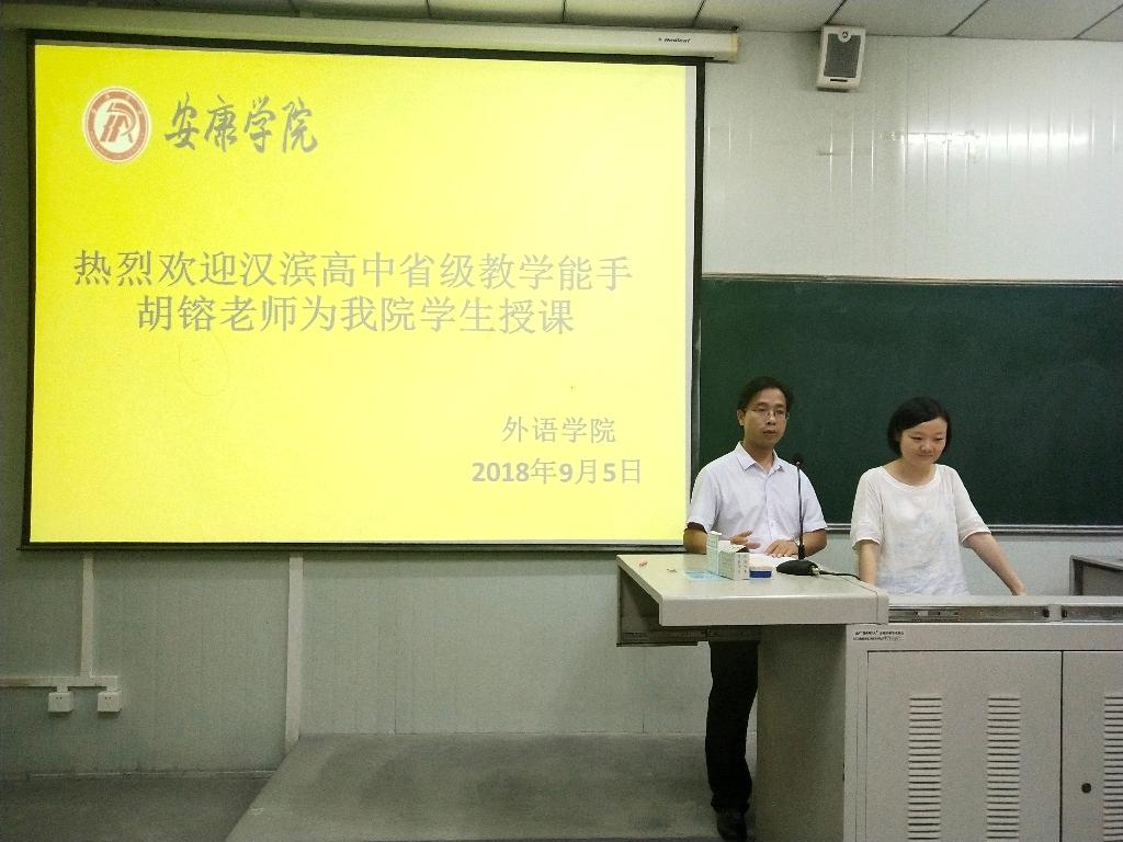 為推進(jìn)校內(nèi)外師資共同體與雙師課程建設(shè),提高我院英語師范生教育教學(xué)能力,熟悉一線中小學(xué)英語教學(xué)實(shí)際,培養(yǎng)合格英語教師與英語應(yīng)用型人才,9月4日,我院特聘陜西省中學(xué)英語教學(xué)能手、漢濱高中骨干教師胡镕在1021教室為英語專業(yè)2016級(jí)和2018級(jí)專升本80余名師范生開設(shè)《中小學(xué)英語課堂教學(xué)案例分析》課程,解讀中小學(xué)英語課程標(biāo)準(zhǔn)與課堂教學(xué)操作流程,并作示范教學(xué)。