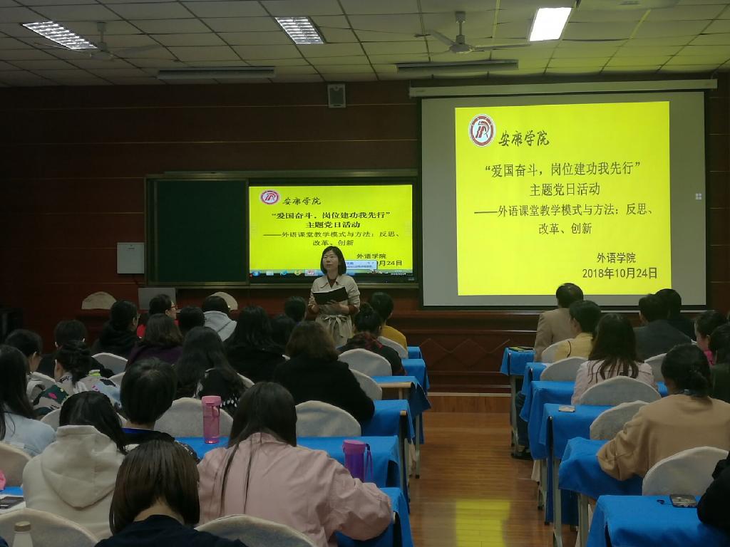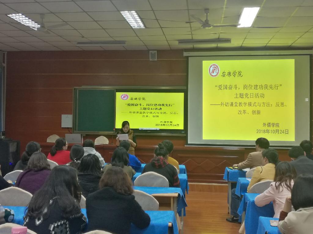 為貫徹落實(shí)習(xí)近平總書記系列講話精神及中共陜西省委高教工委、陜西省教育廳《關(guān)于在全省教育系統(tǒng)知識(shí)分子中深入開展“弘揚(yáng)愛國(guó)奮斗精神、建功立業(yè)新時(shí)代”活動(dòng)的實(shí)施方案》,大力推進(jìn)黨建工作與教育教學(xué)工作的有機(jī)融合,使廣大師生將愛國(guó)奮斗精神化作工作、學(xué)習(xí)的具體行動(dòng),10月24日下午,外語學(xué)院黨總支在1018多功能會(huì)議室舉行了“愛國(guó)奮斗,崗位建功我先行”主題黨日活動(dòng)。本次活動(dòng)以“外語課堂教學(xué)模式與方法:反思、改革、創(chuàng)新”為主題,展開課堂教學(xué)創(chuàng)新研討。外語學(xué)院黨總支(教工一黨支部、教工二黨支部、學(xué)生黨支部)全體黨員、教師及部分學(xué)生代表參加了此次黨日活動(dòng),活動(dòng)由外語學(xué)院副院長(zhǎng)張哲華主持。