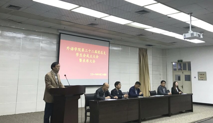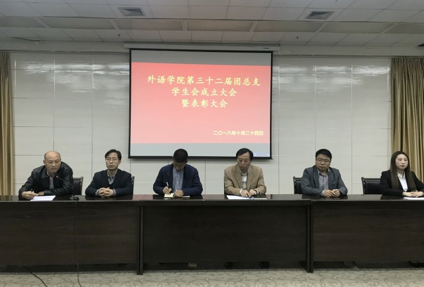 2018年10月24日晚19:30,外語學(xué)院第32屆團(tuán)總支、學(xué)生分會成立暨表彰大會在圖書館報告廳舉行。外語學(xué)院院長哈紅光、外語學(xué)院黨總支書記郭家平、外語學(xué)院副院長張哲華、李繼平,學(xué)工辦主任兼團(tuán)總支書記郝禮軍以及第31屆團(tuán)總支、學(xué)生分會主席團(tuán)成員和32屆團(tuán)總支、學(xué)生分會全體學(xué)生干部出席本次會議。大會由郝禮軍主持。