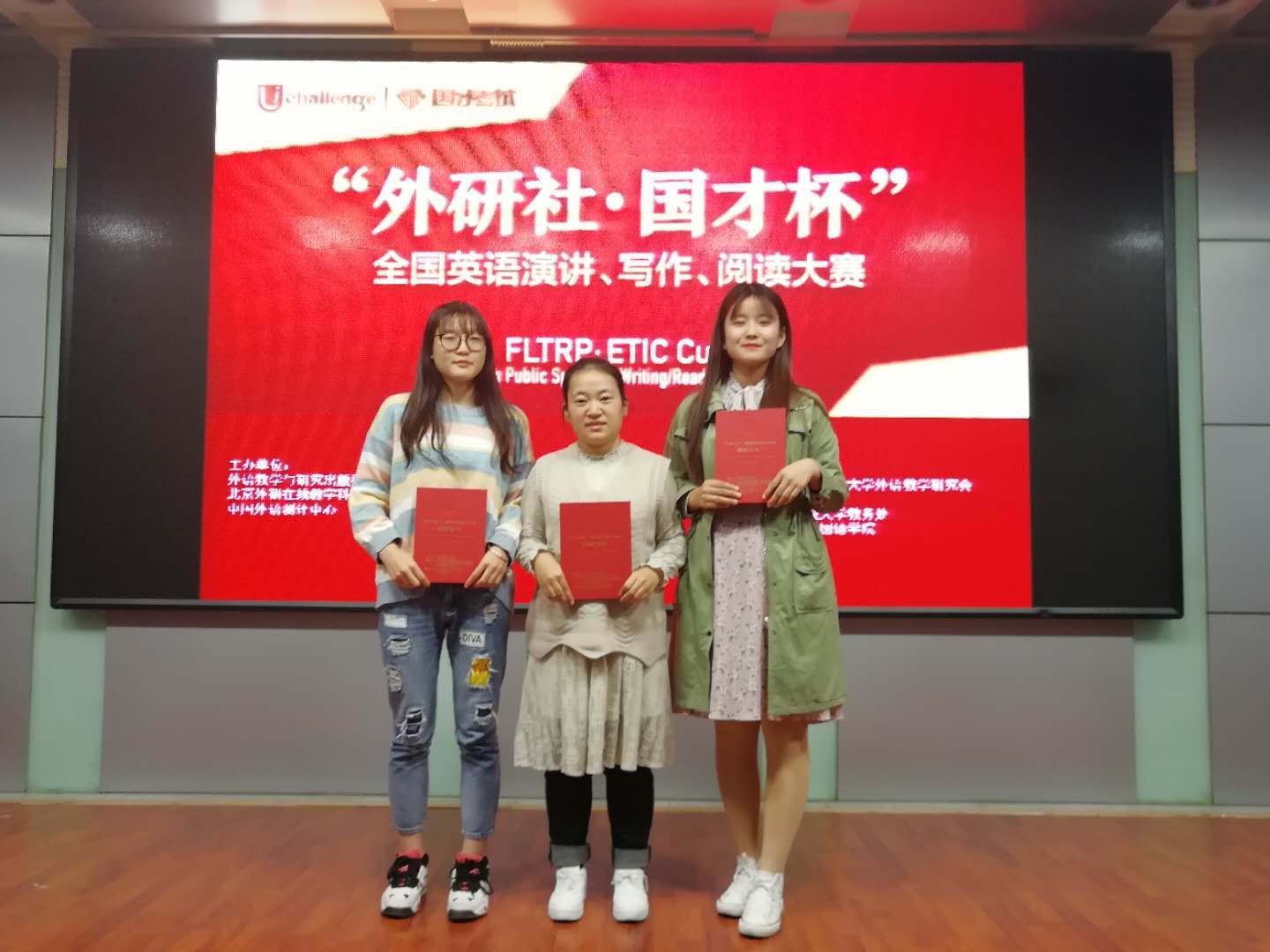 10月27日,由外語(yǔ)教學(xué)與研究出版社、教育部高等學(xué)校大學(xué)外語(yǔ)教學(xué)指導(dǎo)委員會(huì)、教育部高等學(xué)校英語(yǔ)專業(yè)教學(xué)指導(dǎo)分委員會(huì)、中國(guó)外語(yǔ)教育研究中心聯(lián)合主辦,陜西高等學(xué)校大學(xué)外語(yǔ)教學(xué)研究會(huì)承辦的2018“外研社·國(guó)才杯”全國(guó)英語(yǔ)演講、寫作、閱讀大賽陜西省復(fù)賽在西安科技大學(xué)臨潼校區(qū)舉行,來(lái)自全省47所高校的近300名選手參加了本次大賽。我校外語(yǔ)學(xué)院賈國(guó)濤、王倩、數(shù)統(tǒng)學(xué)院何珊同學(xué)榮獲寫作大賽三等獎(jiǎng),外語(yǔ)學(xué)院白雪、樊榮和文傳學(xué)院易曉琴同學(xué)榮獲閱讀大賽三等獎(jiǎng);農(nóng)生學(xué)院韓韶芝同學(xué)榮獲演講大賽三等獎(jiǎng)。