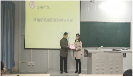 為進(jìn)一步推進(jìn)我院“雙師”課程建設(shè),11月21日晚7點,我院特邀2014屆優(yōu)秀校友、漢濱初中英語骨干教師陳秋月為全體三年級師范生授課。該課程在江南校區(qū)10號教學(xué)樓1022室召開。“雙師”課程負(fù)責(zé)人,副院長張哲華全程參與并旁聽了陳秋月老師的授課。課前,我院舉行了外語學(xué)院雙師課程兼職教師聘任儀式。副院長張哲華為陳秋月老師頒發(fā)了聘書。