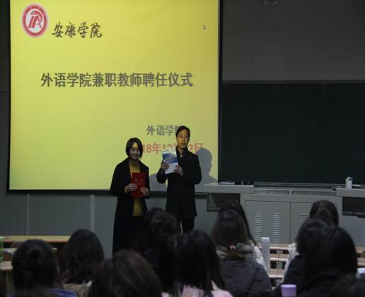 課前,我院舉行了外語學(xué)院雙師課程兼職教師聘任儀式,張哲華副院長為黨信菊老師頒發(fā)了聘書并曾送了他主編的《實(shí)用中小學(xué)英語教學(xué)法教程》一書。