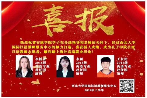 近年來,外語學院高度重視學生的國際合作教育,2016年學院與國家漢辦陜西分中心簽訂合作協(xié)議,成為陜西省地方高校為數(shù)不多的公派漢語志愿教師培訓基地。打開國際視野,走向國際市場,開展國際層面的學術文化交流是當前外語發(fā)展的時代需求;國際漢語教師培訓和輸出對外語學院學生的高端就業(yè),教師專業(yè)發(fā)展都是千載難逢的好機會!在外語學院領導和老師的關懷下,經(jīng)過西北大學國際漢語教師服務中心的傾力打造以及國家漢辦北京外國語大學外研社培訓中心培訓,成功公派王長倫、李軼倩、李穎3名同學赴海外從事漢語教育工作,這充分體現(xiàn)了外語學院教育教學質(zhì)量的不斷提高、學生就業(yè)渠道的不斷拓寬。