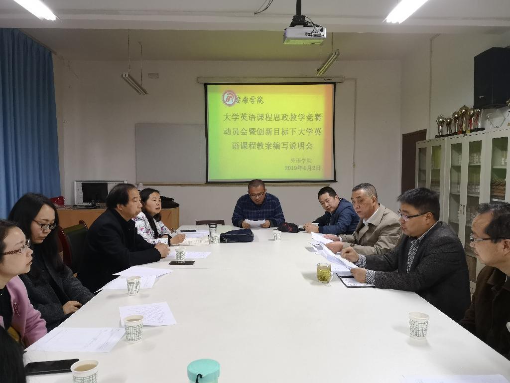 4月2日下午,外語學院在6109會議室召開專題教學工作會議,進行大學英語課程思政教學競賽工作動員和創(chuàng)新目標下大學英語課程教案編寫說明。大英部主任李繼平、教研室主任劉子富及全體大學英語教師參加會議。