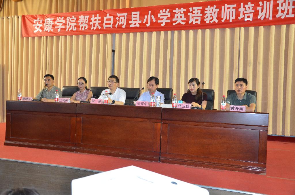 7月15日上午,安康學(xué)院幫扶白河縣小學(xué)英語教師培訓(xùn)班開班儀式在白河縣城關(guān)鎮(zhèn)中心小學(xué)舉行。活動由白河縣教研室主任唐明玉主持,白河縣教體與科技局副局長黃濤、外語學(xué)院副院長張哲華、安康市小學(xué)英語教學(xué)研究會副理事長江利俠、汪玉桂等出席開班儀式。白河縣全體小學(xué)英語教師參加。