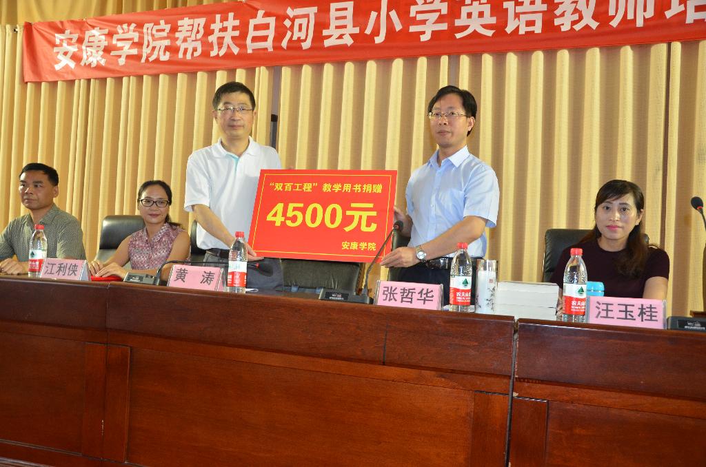 在開班儀式上,黃濤代表白河縣教體與科技局、縣教研室對安康學(xué)院外語學(xué)院專家支持白河基礎(chǔ)教育事業(yè)表示感謝。張哲華代表培訓(xùn)專家致辭,他指出,服務(wù)地方基礎(chǔ)教育是地方高校的使命和責(zé)任,外語學(xué)院將不遺余力,通過師資培訓(xùn),為振興白河基礎(chǔ)英語教育事業(yè),提高白河小學(xué)英語教育教學(xué)水平貢獻力量。隨后,黃濤副局長代表全體小學(xué)英語教師接受了安康學(xué)院捐贈的中小學(xué)英語教師教學(xué)用書。