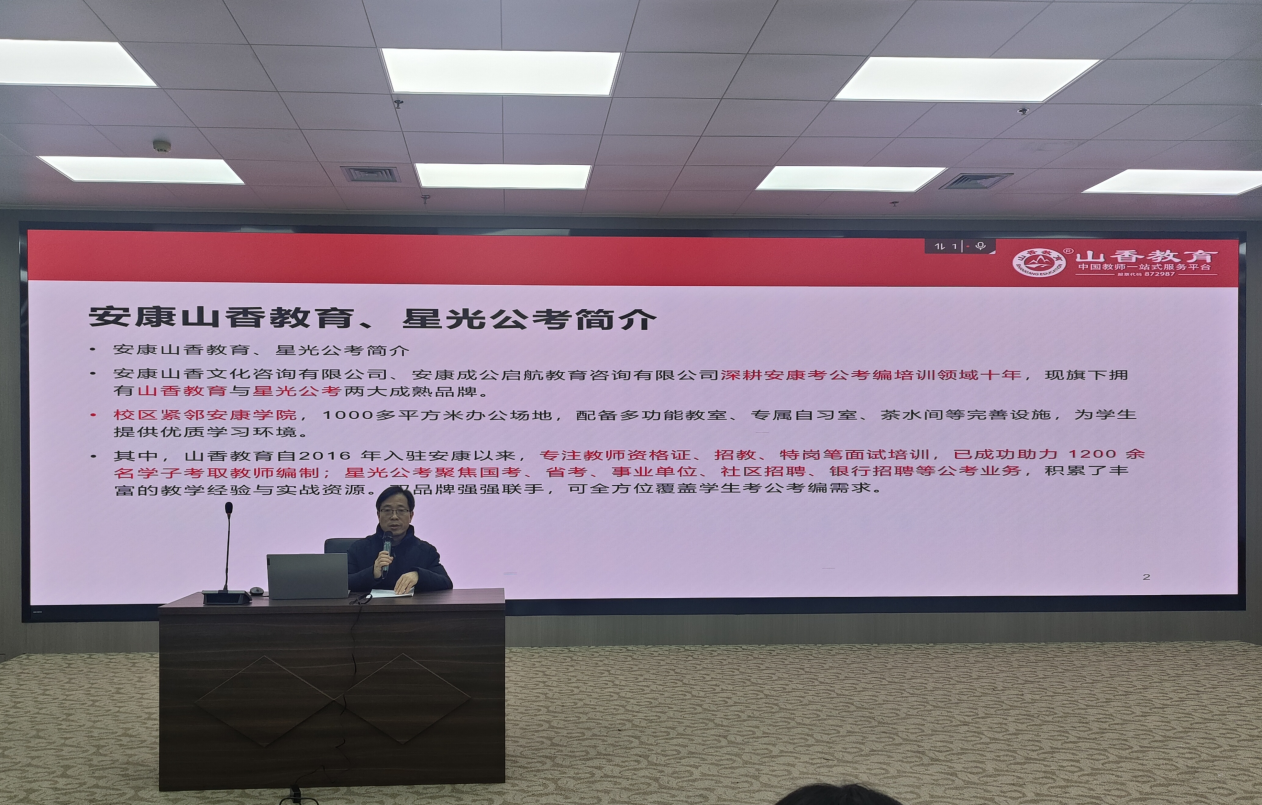 為助力師范生高效備考教師資格證考試,提升就業(yè)核心競爭力,1月4日下午,外語學(xué)院在圖書館六樓報告廳成功舉辦教師資格證備考培訓(xùn)講座。本次講座特邀安康山香教育講師趙海申主講,外語學(xué)院院長張哲華、2023級、2024級英語專業(yè)全體學(xué)生、2025級卓越班學(xué)生及文傳學(xué)院、數(shù)統(tǒng)學(xué)院、體育學(xué)院等學(xué)院學(xué)生代表參加本次講座。講座由外語學(xué)院學(xué)工辦主任梁博文主持。