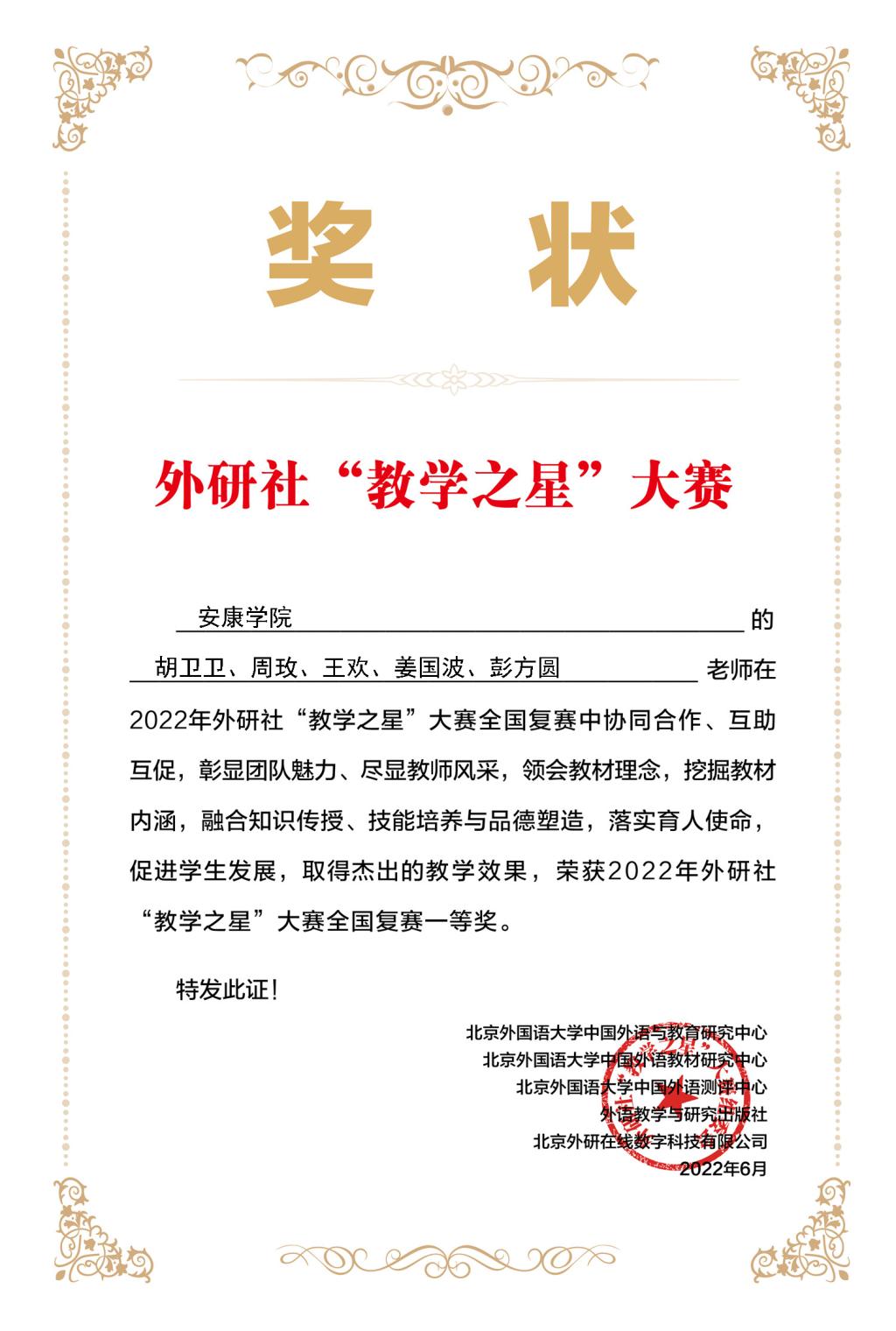 近日,2022年外研社“教學(xué)之星”大賽全國復(fù)賽結(jié)果揭曉。外語學(xué)院推薦的兩個教學(xué)團隊在全國各高校共計569份參賽作品中脫穎而出:由副院長胡衛(wèi)衛(wèi)作為團隊負(fù)責(zé)人的專業(yè)教師教學(xué)團隊(成員:周玫、王歡、姜國波、彭方圓)和向艷麗副教授帶領(lǐng)的大學(xué)英語教學(xué)團隊(成員:梁藝凡、鄧雪玲、錢莉、周凡雅)分別獲得了英語專業(yè)組全國復(fù)賽一等獎和大學(xué)英語組全國復(fù)賽一等獎的好成績。