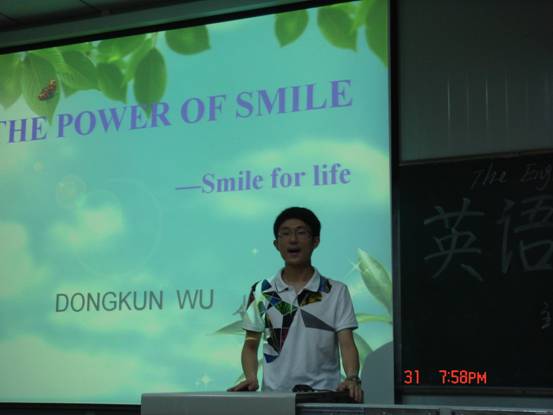 本次大賽主題為“The Power of smile”。30名在日前舉辦的初選中勝出的選手到場比賽。在限時三分鐘的演講中,選手們緊扣主題,慷慨陳詞,自信飛揚,贏得了在場觀眾陣陣熱烈的掌聲,充分展現(xiàn)了我院大學生的風采。本次復(fù)賽勝出的12名選手將代表全校大學英語比賽選手,參加6月14日舉辦的全校決賽,期待選手們在決賽中有更精彩的表現(xiàn)。賽后由李金老師所作的激情點評,將氣氛推向高潮。此次比賽為我校非英語專業(yè)同學提供了展現(xiàn)英語風采的舞臺,為校園英語文化建設(shè)錦上添花。