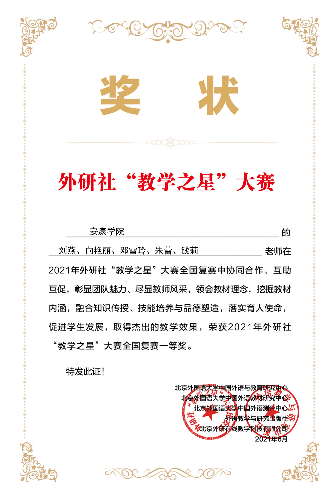 近日,2021年外研社“教學(xué)之星”大賽全國復(fù)賽結(jié)果揭曉。由我校外語學(xué)院教師劉燕、向艷麗、鄧雪玲、朱蕾、錢莉組成的大學(xué)英語教學(xué)團隊在全國復(fù)賽395個參賽團隊中脫穎而出,榮獲本屆大賽大學(xué)英語組全國復(fù)賽一等獎。