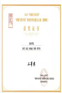 近日,2025“外研社國才杯”“理解當(dāng)代中國”陜西省外語能力大賽(教師組)獲獎名單公布,外語學(xué)院英語專業(yè)教學(xué)團(tuán)隊(duì)(王歡、蔡婷婷、李慧清、徐雯、安妮)、大學(xué)英語教學(xué)團(tuán)隊(duì)(朱蕾、高亮、向艷麗、劉燕、鄧雪玲)分別獲得陜西省二等獎。