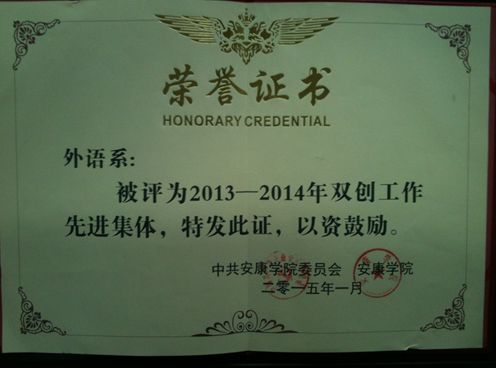 4月2日下午,學(xué)校在圖書館六樓報(bào)告廳召開了穩(wěn)定安全與雙創(chuàng)工作總結(jié)暨表彰大會(huì),我系榮獲雙創(chuàng)工作“先進(jìn)集體”, 輔導(dǎo)員楊厚東和常遠(yuǎn)紅獲雙創(chuàng)工作“先進(jìn)個(gè)人”;教師彭方圓、輔導(dǎo)員楊厚東、2012級(jí)英語(yǔ)3班學(xué)生劉蓓蓓和13級(jí)英語(yǔ)3班學(xué)生劉靖茹等4名師生獲穩(wěn)定安全“先進(jìn)個(gè)人”。