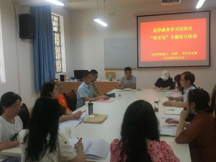 6月30日下午,外語學(xué)院教工第一黨支部、學(xué)生黨支部在6109會(huì)議室開展了“善作為”主題黨日活動(dòng),教工第一黨支部、學(xué)生黨支部全體黨員參加了活動(dòng)。活動(dòng)由教工第一黨支部書記陳玉平主持。