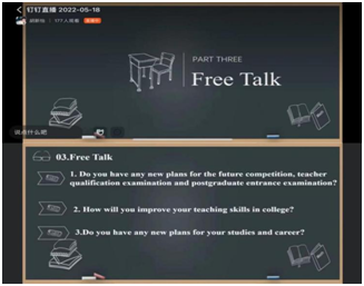 伴隨著積極熱烈的線上氣氛,活動進入到了第三階段free talk環(huán)節(jié)。同學們暢所欲言、各抒己見,認真探討了關于如何考取教師資格證,如何以賽促學提高個人的教學能力等話題。