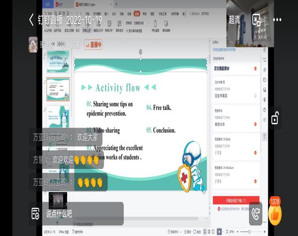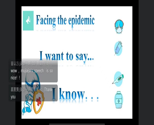 10月19日下午,在動(dòng)聽的經(jīng)典歌曲Scarborough Fair中開始,主持人嚴(yán)子祺和左依婷同學(xué)致開場詞、學(xué)生代表發(fā)言。映入眼簾的是一個(gè)抗疫獨(dú)白視頻;在視頻播放完畢后,主持人向觀眾們拋出了有關(guān)視頻中的兩個(gè)問題,同學(xué)們對活動(dòng)的熱情已經(jīng)超過了空間的局限,與主持人們積極互動(dòng),使這一環(huán)節(jié)有序、順利地進(jìn)行。其中,張心妮、劉榕榕、馬一帆三位同學(xué)表現(xiàn)優(yōu)異,就疫情防控的重要性和方法做出了自己的看法,內(nèi)容充分、語音語調(diào)優(yōu)美,帶動(dòng)了同學(xué)們學(xué)習(xí)英語的氛圍。