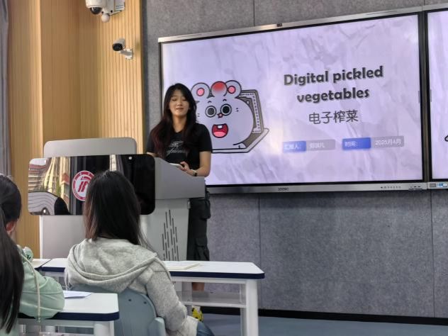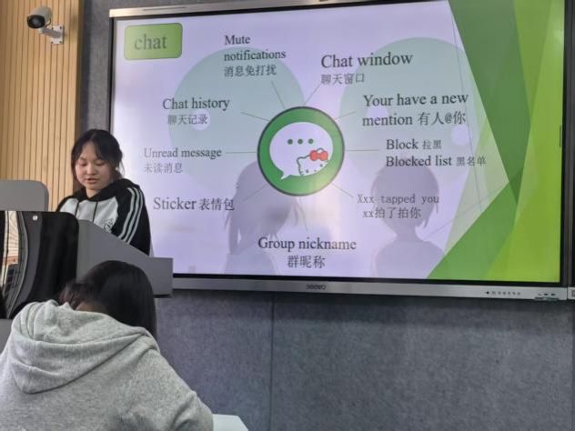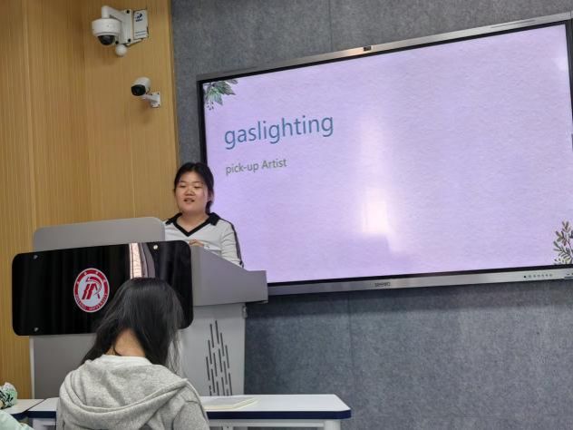 隨后的講解中中,王心妮同學(xué)通過"全球青年著裝風(fēng)格對比"的趣味展示,帶領(lǐng)觀眾感受服飾文化背后的語言符號;董昱彤同學(xué)則聚焦情感話題,以"Crush(心動)”、“Situationship(曖昧關(guān)系)”等網(wǎng)絡(luò)熱詞為線索,結(jié)合“ gaslighting(煤氣燈效應(yīng))”理論深度剖析情感PUA現(xiàn)象,并以“Stimp(舔狗)”為案例,呼吁同學(xué)們保持理性情感觀。鄭琪凡同學(xué)以“Digital Pickled Vegetables(電子榨菜)”這一網(wǎng)絡(luò)新詞為切入點,幽默揭示當(dāng)代青年"碎片化學(xué)習(xí)+娛樂"的生活狀態(tài);從流行文化透視語言生命力活動后半程聚焦網(wǎng)絡(luò)熱詞的文化穿透力。除此之外,還有關(guān)于“Abstract Culture(抽象文化梗)”、“Blind Box Economy(盲盒經(jīng)濟)”、“We Chat”等流行的網(wǎng)絡(luò)熱詞。