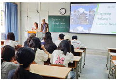 活動的高潮當(dāng)屬四大文化主題區(qū)的輪換體驗。在“非遺傳承”部分,同學(xué)們通過觀看漢調(diào)二黃經(jīng)典唱段視頻,聆聽了安康戲曲的悠揚旋律,感受了傳統(tǒng)文化的深厚底蘊;“舌尖安康”部分,美食視頻與主持人的英語描述相結(jié)合,讓同學(xué)們在味蕾上體驗了安康美食的獨特風(fēng)味;“自然風(fēng)光”部分,風(fēng)光短片與生態(tài)保護知識的雙語講解,激發(fā)了同學(xué)們設(shè)計英文環(huán)保標(biāo)語的熱情;而“手作魅力”環(huán)節(jié)則充滿藝術(shù)氣息,傳統(tǒng)非遺手工作品的展示,讓同學(xué)們領(lǐng)略到了手工藝術(shù)的精湛技藝。主持人用雙語介紹了這些作品背后的古人智慧,讓同學(xué)們在欣賞藝術(shù)的同時,也感受到了傳統(tǒng)文化的魅力。