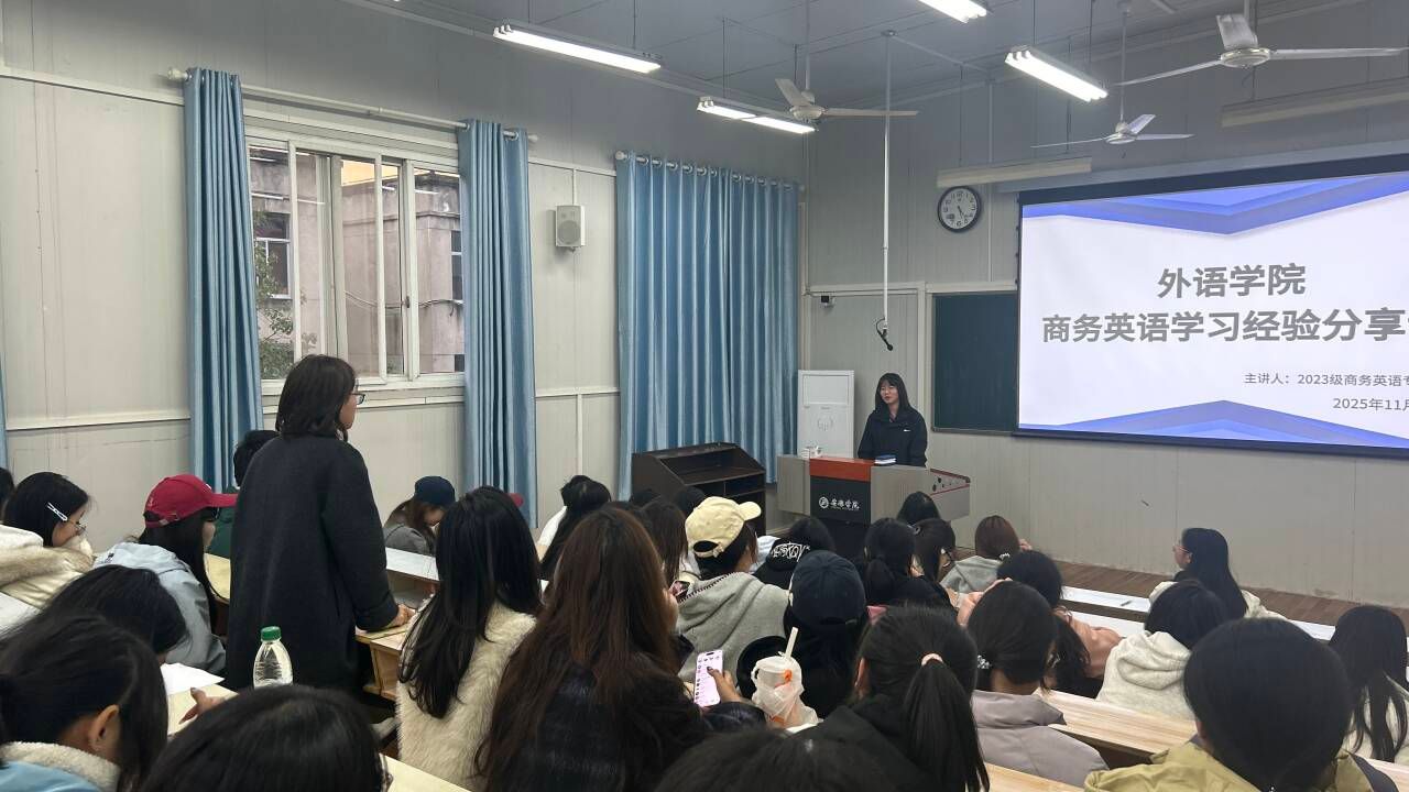 為切實幫助2025級商務英語專業(yè)新生快速適應專業(yè)學習、明確發(fā)展方向、提升學習實效,11月12日下午,外語學院在6405教室成功舉辦優(yōu)秀學生代表學習經(jīng)驗分享會。本次活動邀請2023級徐舒雨、李東玫、董曉悅、王怡軒四位高年級優(yōu)秀學生代表,圍繞專業(yè)認知、學習提升、就業(yè)優(yōu)勢、未來規(guī)劃四大核心議題,為新生提供系統(tǒng)性、專業(yè)化的經(jīng)驗指導。