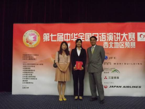 5月19日,我系日語專業(yè)09級(jí)學(xué)生劉維娜在指導(dǎo)教師劉婷和外教赤松秀夫的帶領(lǐng)下,參加了在蘭州大學(xué)舉辦的“第七屆中華日語演講比賽西北賽區(qū)預(yù)賽”,該同學(xué)以其沉著的表現(xiàn)、扎實(shí)的學(xué)習(xí)基礎(chǔ)和良好的儀態(tài)贏得了評(píng)委好評(píng),最終獲得“優(yōu)秀獎(jiǎng)”。