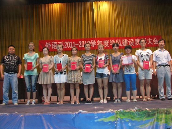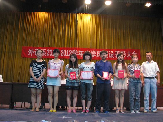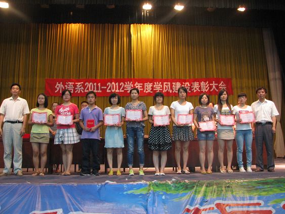 會(huì)上,李延福書(shū)記宣讀了《外語(yǔ)系黨總支2011-2012學(xué)年度學(xué)風(fēng)建設(shè)工作總結(jié)》,他說(shuō),作為學(xué)校學(xué)風(fēng)建設(shè)的試點(diǎn)系之一,本學(xué)年度在精神文明、學(xué)生就業(yè)、新生軍訓(xùn)、辯論賽、運(yùn)動(dòng)會(huì)、籃球賽、健美操、雙創(chuàng)工作等方面獲學(xué)校及以上先進(jìn)集體獎(jiǎng)12項(xiàng);在考研、專(zhuān)升本、學(xué)科競(jìng)賽、專(zhuān)業(yè)過(guò)級(jí)、文學(xué)創(chuàng)作等方面有49人被獲得佳績(jī);李繼平主任宣讀了《外語(yǔ)系黨總支關(guān)于表彰學(xué)風(fēng)建設(shè)先進(jìn)個(gè)人的決定》,并一一宣讀了獲獎(jiǎng)學(xué)生名單。被四川師范大學(xué)錄取為研究生的08級(jí)英語(yǔ)本科2本劉水琴同學(xué)代表獲獎(jiǎng)學(xué)生發(fā)言,并作了考研經(jīng)驗(yàn)介紹。