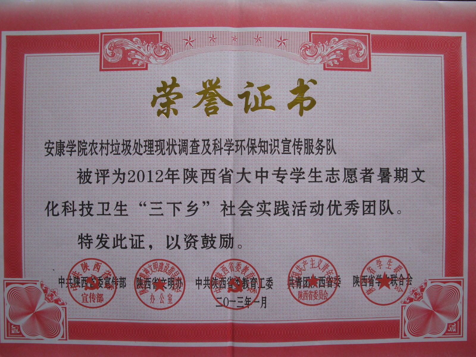 2012年暑期,外語系團總支積極響應團委的號召,精心組織社會實踐服務隊參加大學生文化科技“三下鄉(xiāng)”社會實踐活動,其“農(nóng)村垃圾處理現(xiàn)狀調(diào)查及科學環(huán)保知識宣傳服務隊”被省委宣傳部、省文明辦、省教工委、團省委、省學聯(lián)授予“陜西省大中專學生志愿者暑期文化科技衛(wèi)生“三下鄉(xiāng)”社會實踐活動優(yōu)秀團隊”,指導老師周靜被評為暑期“三下鄉(xiāng)”社會實踐先進個人。