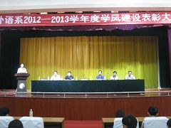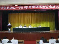 7月2日下午,外語系2012-2013學(xué)年度學(xué)風(fēng)建設(shè)表彰大會在江南校區(qū)大禮堂隆重舉行,系主任哈紅光、黨總支書記李延福、大學(xué)英語教學(xué)部主任李繼平、副主任張哲華、輔導(dǎo)員楊厚東及全系500余名學(xué)生參加了表彰大會,大會由系學(xué)工辦主任任森龍主持。