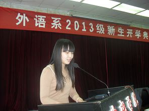 在開學(xué)典禮上,外語系的老生和新生學(xué)生代表也都作了發(fā)言,2010級英語本科專業(yè)的吳瓊向新生們介紹了如何適應(yīng)大學(xué)生活,如何規(guī)劃個人的學(xué)習(xí)生活;2013級新生蔣偉榮代表新生發(fā)言,她表達了成為外語系一名新生的自豪,號召新同學(xué)們拿出“天生我才必有用”的信心和“直掛云帆濟滄海”的勇氣,去迎接新的挑戰(zhàn),開始新的征程。
